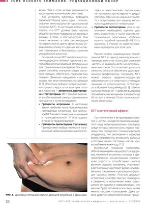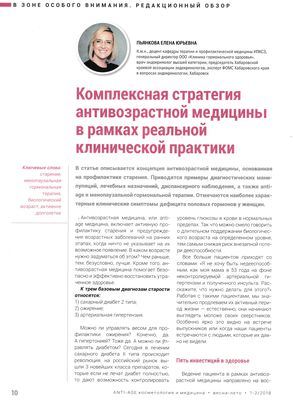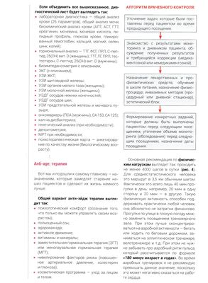 В статье описывается концепция антивозрастной медицины, основанная на профилактике старения. Приводятся примеры диагностических манипуляций, лечебных назначений, диспансерного наблюдения, а также anti age и менопаузальной гормональной терапии. Отмечаются наиболее характерные клинические симптомы дефицита половых гормонов у женщин.