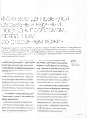 В интервью Регине Бурмистровой Яна Александровна Юцковская отвечает на вопросы и рассказывает о семье, о династии врачей Юцковских, о коллегах, о руководстве кафедрой, Клиниками и Школой, о 20 летии проффесиональной деятельности. Яна Юцковская: «Мой отец, Александр Дмитриевич Юцковский, докто медицинских наук, профессор, талантливейший врач, замечательный человек и лучший в мире папа. Нио каком диктате не могло быть речи, родители всегда поддерживали мой суверинитет. Свои первые шаги как врач я делала во Владивостоке, в клинике отца. Профессию я выбрала сама, и уже в 1994 году говорила что буду косметологом, предполагая что речь идет о серьезных медицинских процедурах». «Мне Всегда нравился серьезный научный подход к проблемам, связанным со старением кожи, с возможностью профилактики возрастных изменений. Статус, авторитет, активная жизненная позиция дают мне возможность постоянного профессионального роста. Я имею право выбирать лучшие технологии и методики, изучать зарубежный опыт коллег и предлагать своим пациентам проверенные, безопасные методы». «Будующее за комплексной профилактикой старения, в коллегиальном подходе к пациенту у косметолога, гинеколога - эндокринолога, уролога - андролога, эстетиста, диетолога и психолога. Пациенты должны научиться принимать и любить себя в любом возрасте, сохранять здоровье, социальную и сексуальную активность». «Есть задачи котрые сегодня нужно выполнить и я и моя команда их выполняем. Возникают новые, есть плановые стратегические задачи, все это обсуждается со мной, я всегда на связи, решения принимаются мобильно, действуем мы оперативно, так все иполучается». «Развитие рынка косметологии я вижу в комплексном подходе к профилактике старения. В тесном междисциплинарном взаимодействии. Всем специалистам нужно понимать важность просветительской работы. Идеальных пациентов никогда не было и не будет. Мы сами их формируем для себя. Клинику будущего одну я уже вижу. Это будет моя клиника на проспекте Мира, двухэтажная, с полным комплексом не только для лица но и для тела. С операционными, с большим упором на эстетическую гинекологию».